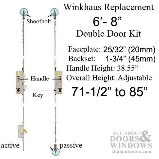 View full detailsWinkhaus One Motion Double Door Kit – 45/92, 6'8" (49906001-KIT)This Winkhaus One Motion replacement kit provides a complete multipoint locking sol...