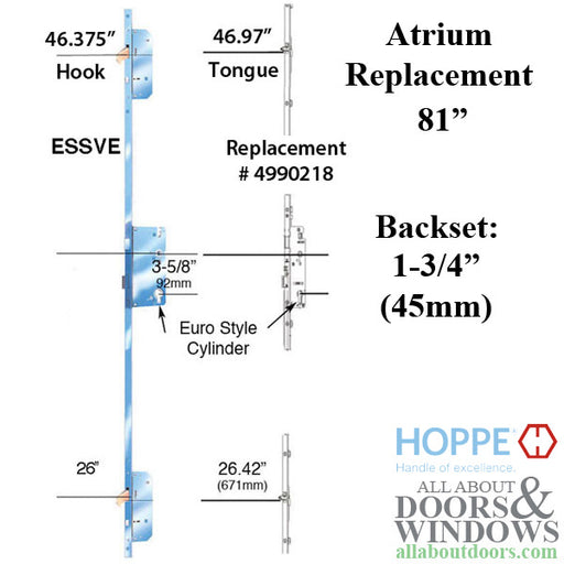View full detailsHoppe 81" Multipoint Lock Kit for ESSVE – 45/92, Euro (4990218-KIT)This Hoppe multipoint lock replacement kit is designed specifically for ESSVE mu...