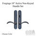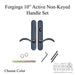 Set includes: 1 inside plate, 1 outside plate, 2 handles, 1 spindle, 1 hex wrench, and installation screws. Priced and sold as set.